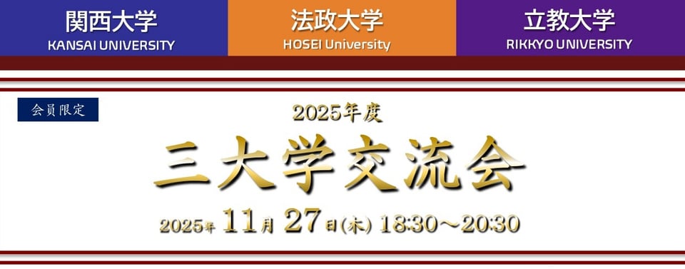 このたび、三大学(関西大学、法政大学、立教大学)の校友・経済人団体が、団体同士の縁をより一層深める機会として、交流会を企画しました。
