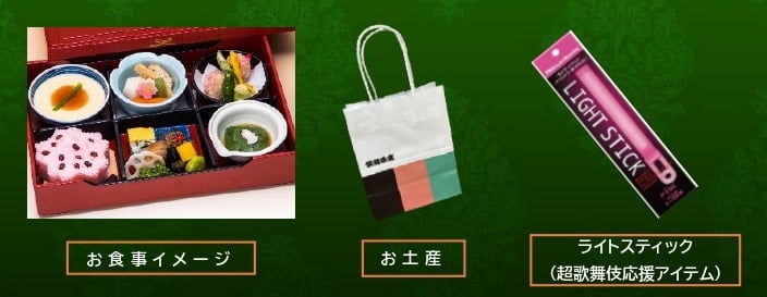 ①18,000円(税込)/1名 (1等席・お食事・お土産・ライトスティック付) ②6,000円(税込)/1名 (3階A席・ライトスティック付) ![]() 第一部終演後、懇親会を開催いたします(任意) |