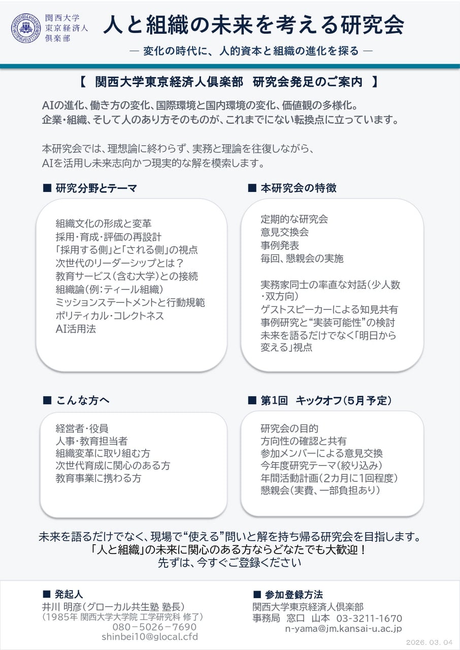 本研究会では、急速な社会変化や技術革新の中で、企業・組織が直面する「人事・人財」および「教育」に関する課題を多角的に捉え、実務と理論の両面から研究・意見交換を行うことを目的とします。